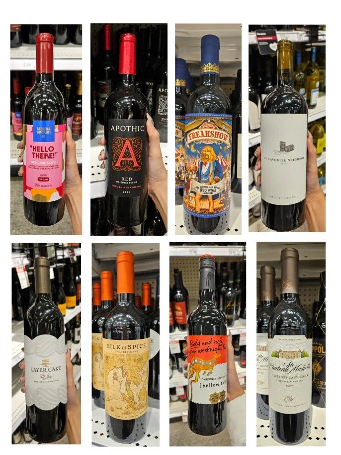 For this project, I set out to design a series of three wine labels that each targeted a different market level: low-end, mid-range, and high-end. To start, I went to local stores to study existing labels and noticed clear differences between tiers. The lower-end bottles often leaned into humor, with playful names and bold illustrations. Mid-range labels had a more contemporary look, keeping things simple, clean, and easy to follow. The higher-end wines usually featured vineyard sketches and classic typefaces like serif or cursive, giving them a more traditional and refined feel.