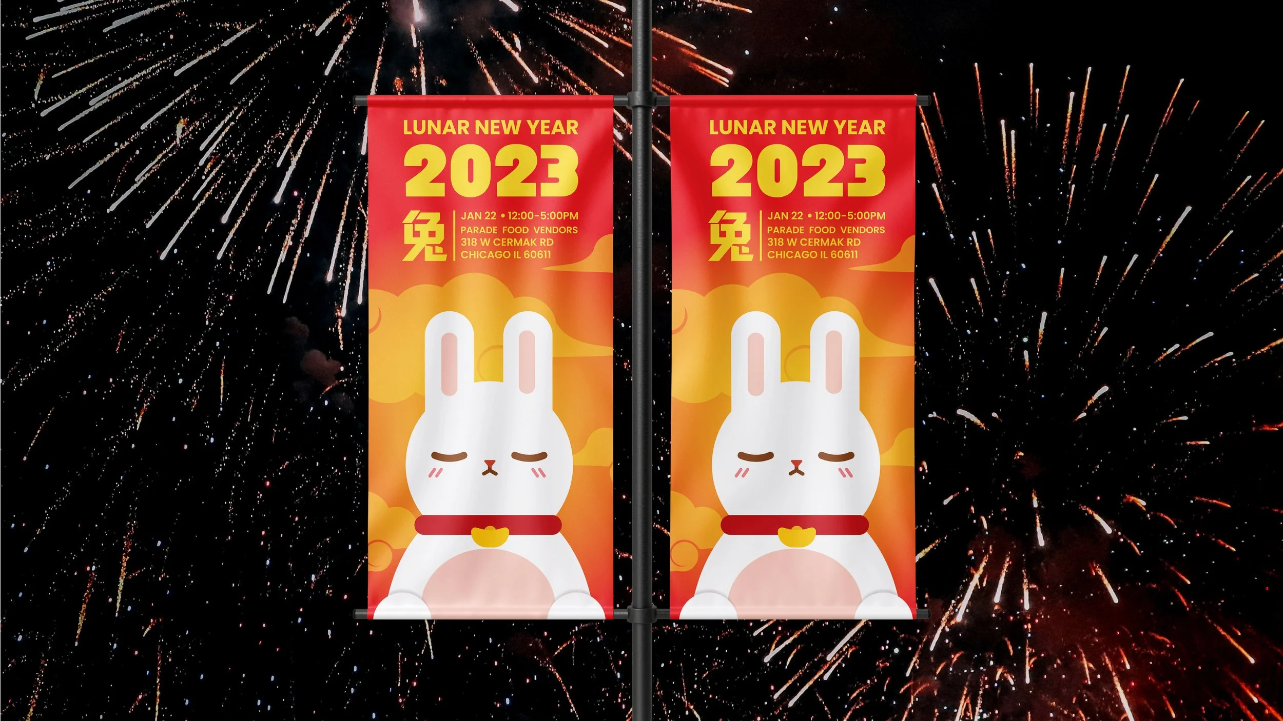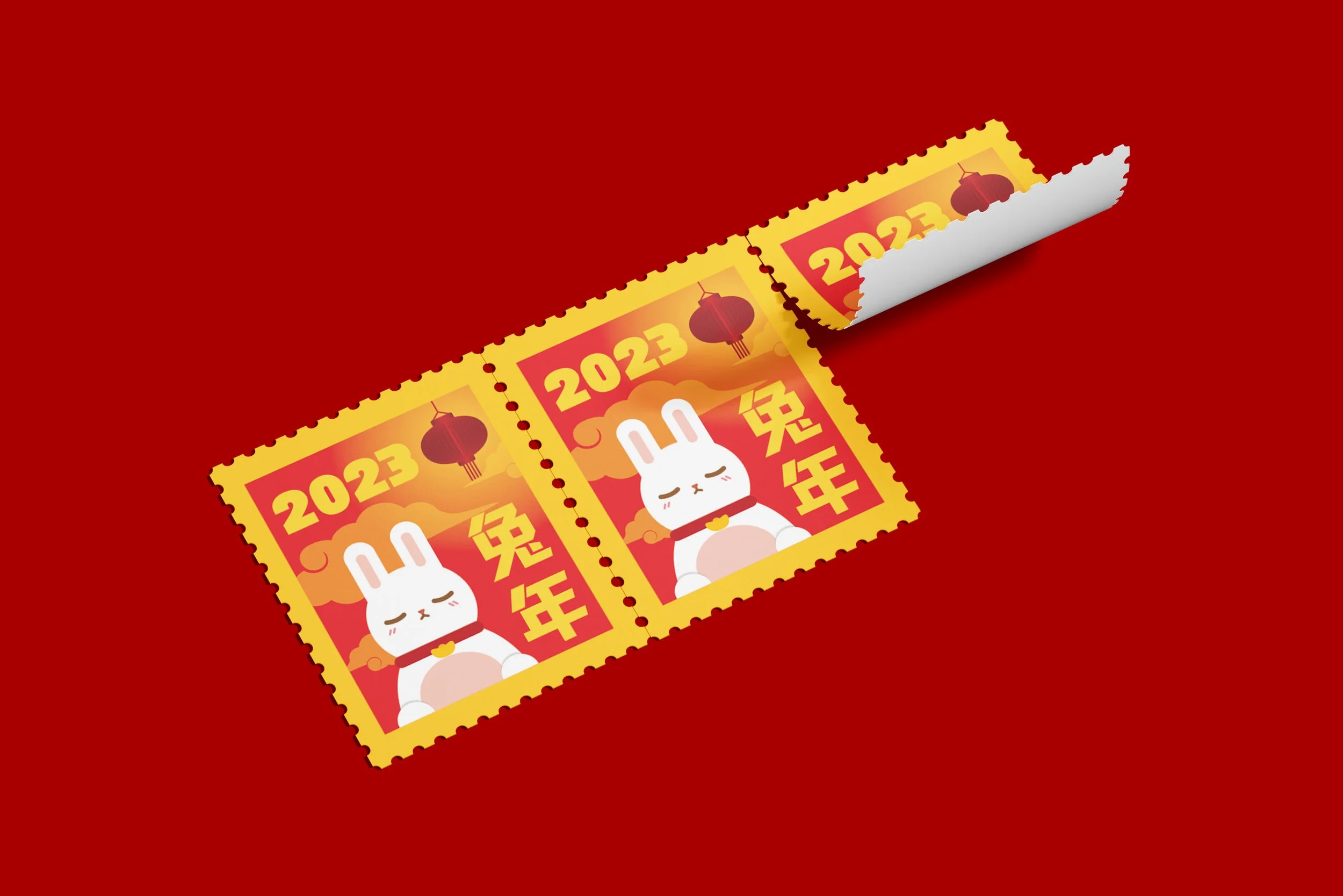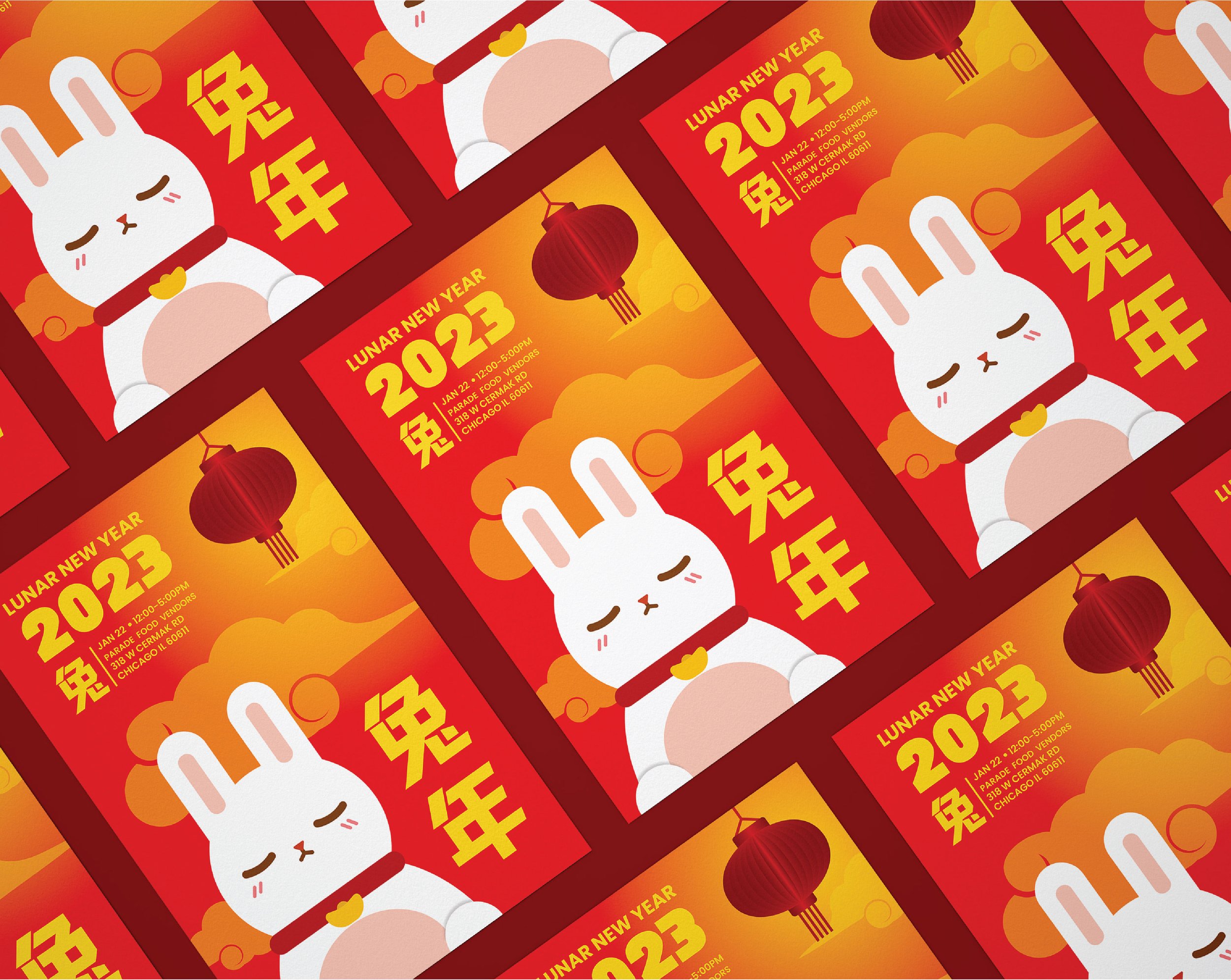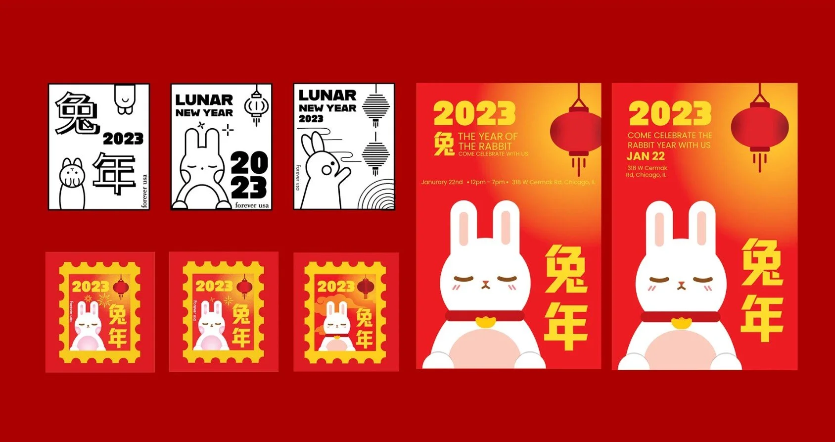 This series was created to celebrate the Year of the Rabbit. A poster and banner were designed to inform people about the Lunar New Year celebration. Red and yellow are recognizable colors often used in New Year celebrations, as they are also used to symbolize luck and prosperity. The stamp stickers are used for stationery and to attract people to the event.